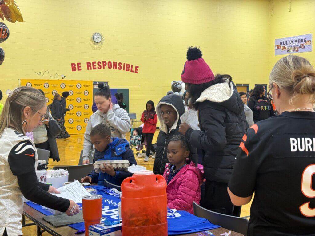 Volunteers from Lowe’s Home Improvement, Young Professionals from the Urban League of Greater Southwest Ohio, and the Urban League Guild filled Burrow Bags and lined them neatly on tables. The volunteers greeted families entering the school’s gymnasium, managed distribution tables, and carried Burrow Bags to families’ cars, ensuring every guest left with a meal.